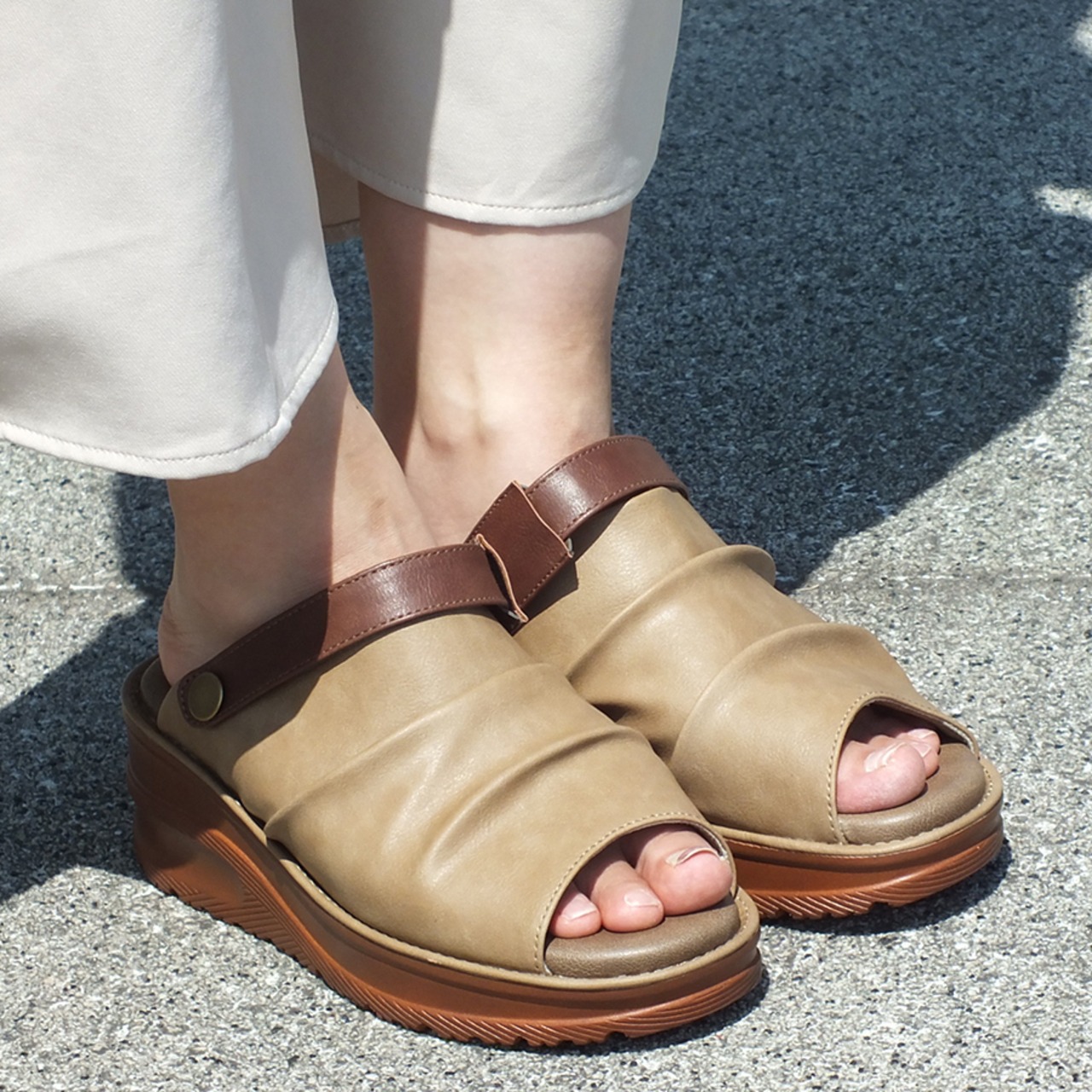 甲部分を包み込み、ギャザー加工を施したちょっぴり大人の2wayカジュアルサンダル。